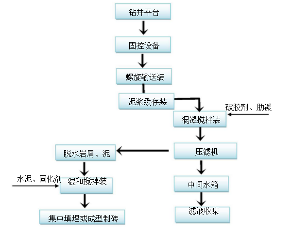 鉆井作業經振動篩、除沙器、離心機分離出的廢棄鉆屑液、泥漿、廢水,經螺旋輸送機送至泥漿緩存收集裝置。鉆井作業至泥漿層時出料以泥漿和鉆井液為主,用泵經管道混合器加破膠劑、劑藥送至混凝罐進行破膠、絮凝,使泥漿中的液相和固相分離,壓濾機進行固液分離,泥餅收集送至儲存場地。再集中填埋,分離液進入高效一體機, 高效一體機集氧化、還原、絮凝、氣浮和HS—ACF—Fenton于一體,進而達到分解、脫穩、絡合、吸附、凝聚、浮除、沉淀等目的,出水經過濾后可直接送入市政污水處理廠作進一步處理,再經吸附凈化裝置,使出水達到國家排放標準,達